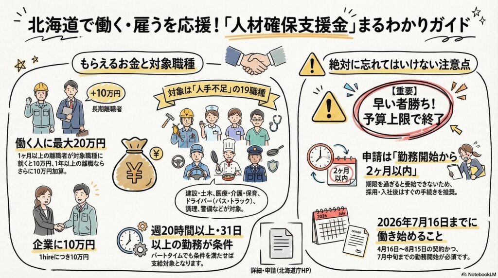 北海道の「人材確保支援事業」は、人手不足が深刻な職種における人材確保を支援するため、要件を満たして就職した求職者と、その方を雇用した道内事業者の双方に対してお金を支給する制度です。